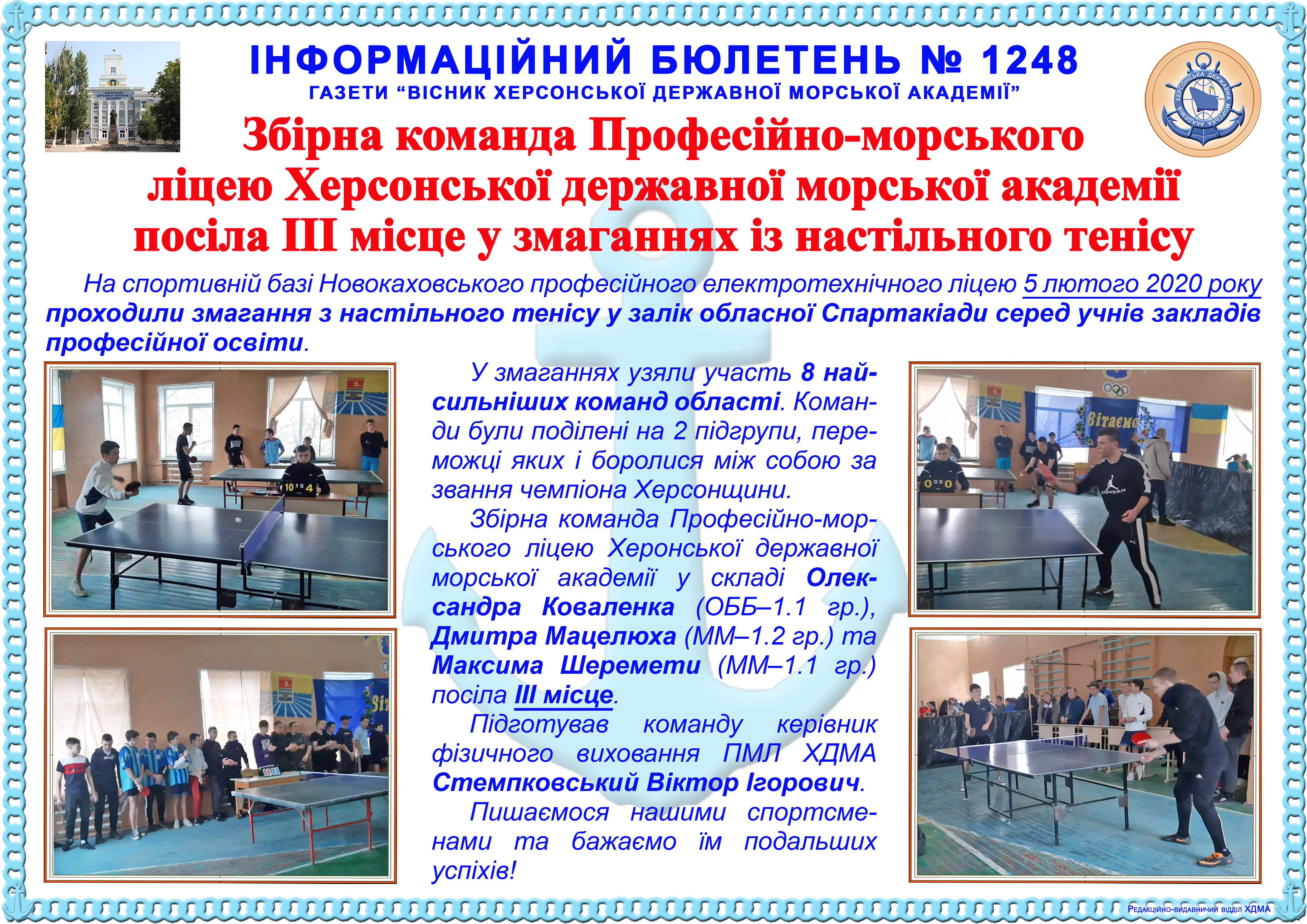 http://repnew.ksma.ks.ua/jspui/handle/123456789/1695| Title: | Інформаційний бюлетень № 1248 Збірна команда Професійно-морського ліцею Херсонської державної морської академії посіла ІІІ місце у змаганнях із настільного тенісу |