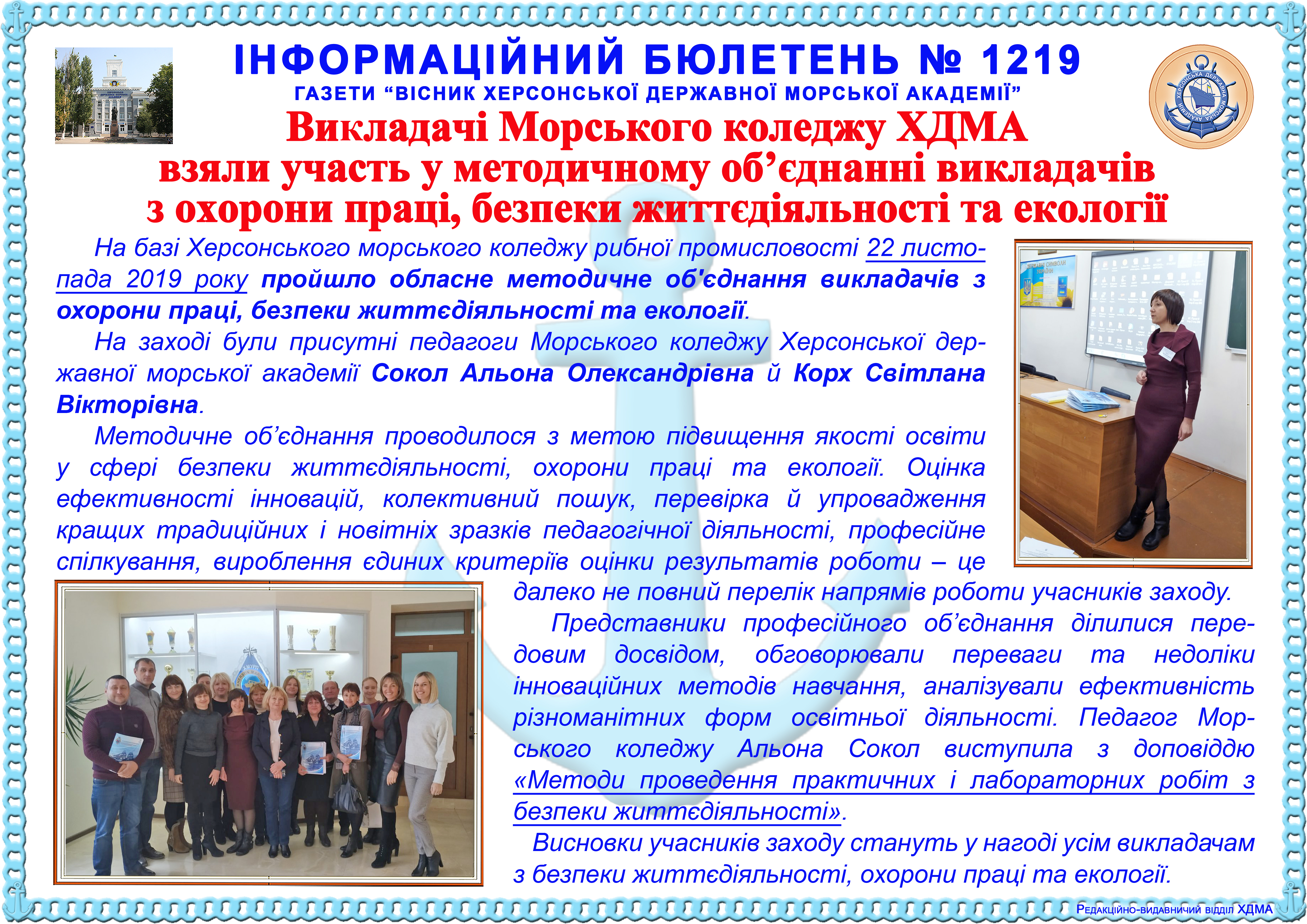 http://repnew.ksma.ks.ua/jspui/handle/123456789/1770| Title: | Інформаційний бюлетень № 1219 Викладачі Морського коледжу ХДМА взяли участь у методичному об’єднанні викладачів з охорони праці, безпеки життєдіяльності та екології |