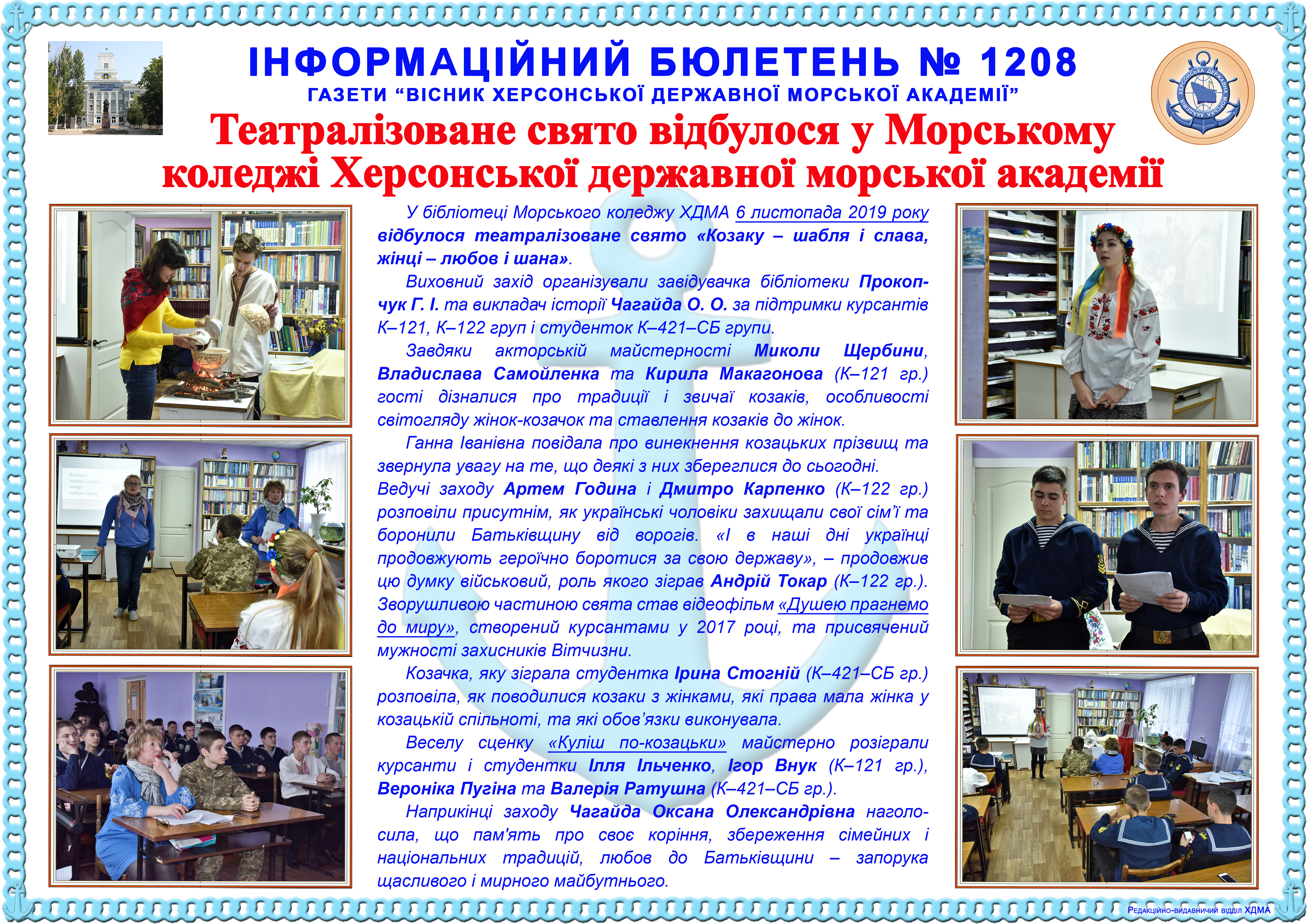 http://repnew.ksma.ks.ua/jspui/handle/123456789/1780| Title: | Інформаційний бюлетень № 1208 Театралізоване свято відбулося у Морському коледжі Херсонської державної морської академії |
