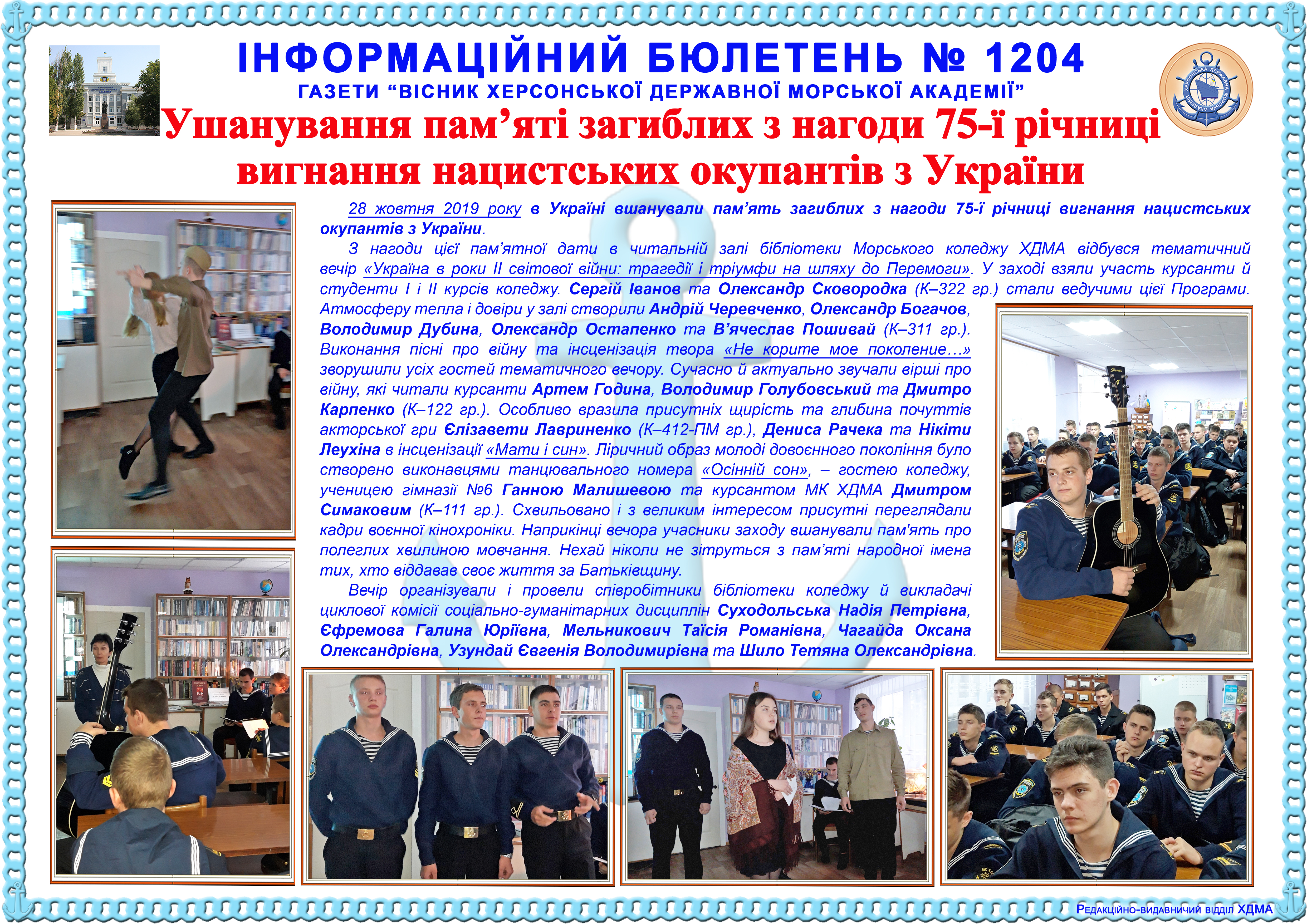 http://repnew.ksma.ks.ua/jspui/handle/123456789/1784| Title: | Інформаційний бюлетень № 1204 Ушанування пам’яті загиблих з нагоди 75-ї річниці вигнання нацистських окупантів з України |