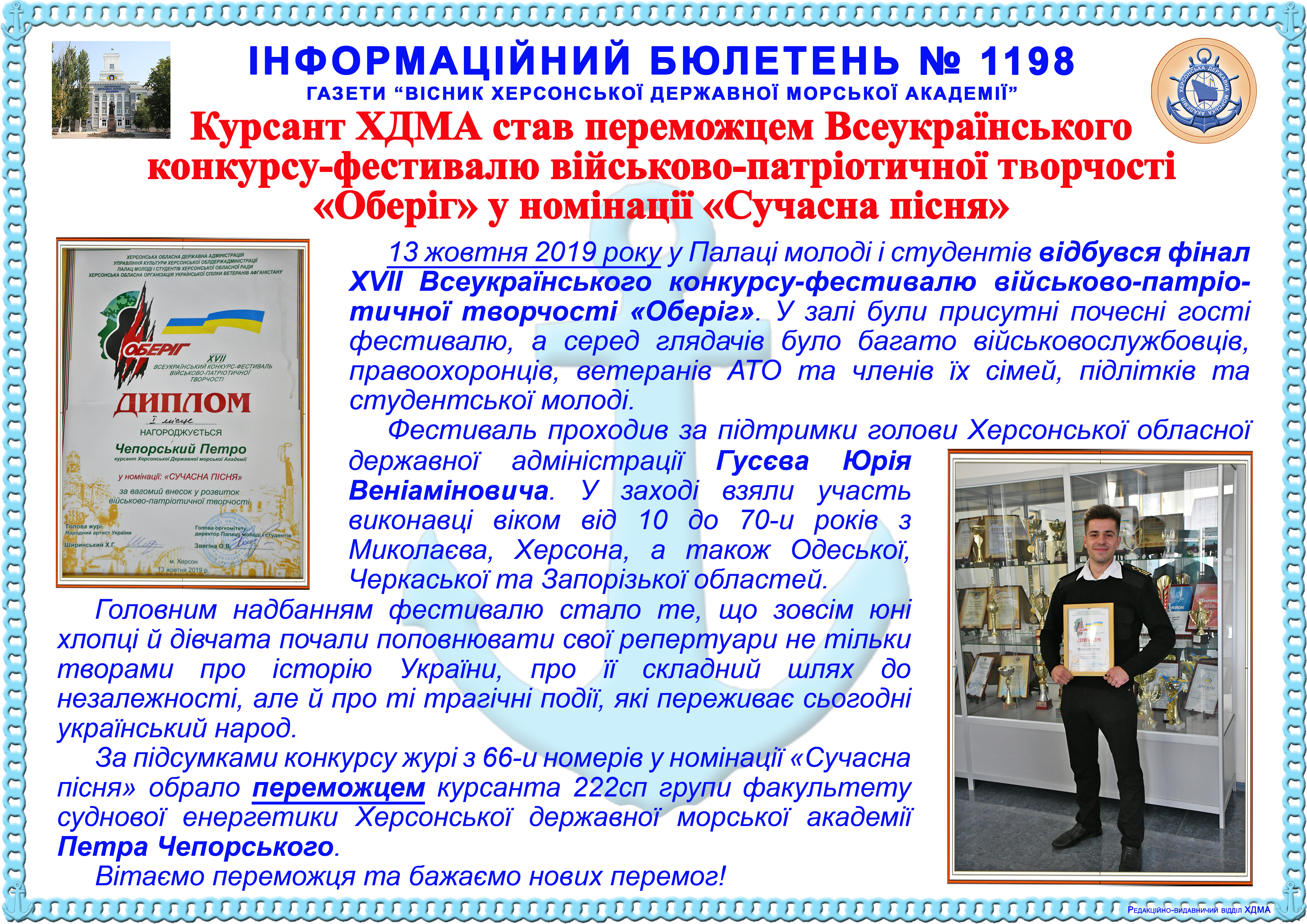 http://repnew.ksma.ks.ua/jspui/handle/123456789/1799| Title: | Інформаційний бюлетень № 1198 Курсант ХДМА став переможцем Всеукраїнського конкурсу-фестивалю військово-патріотичної творчості «Оберіг» у номінації «Сучасна пісня» |