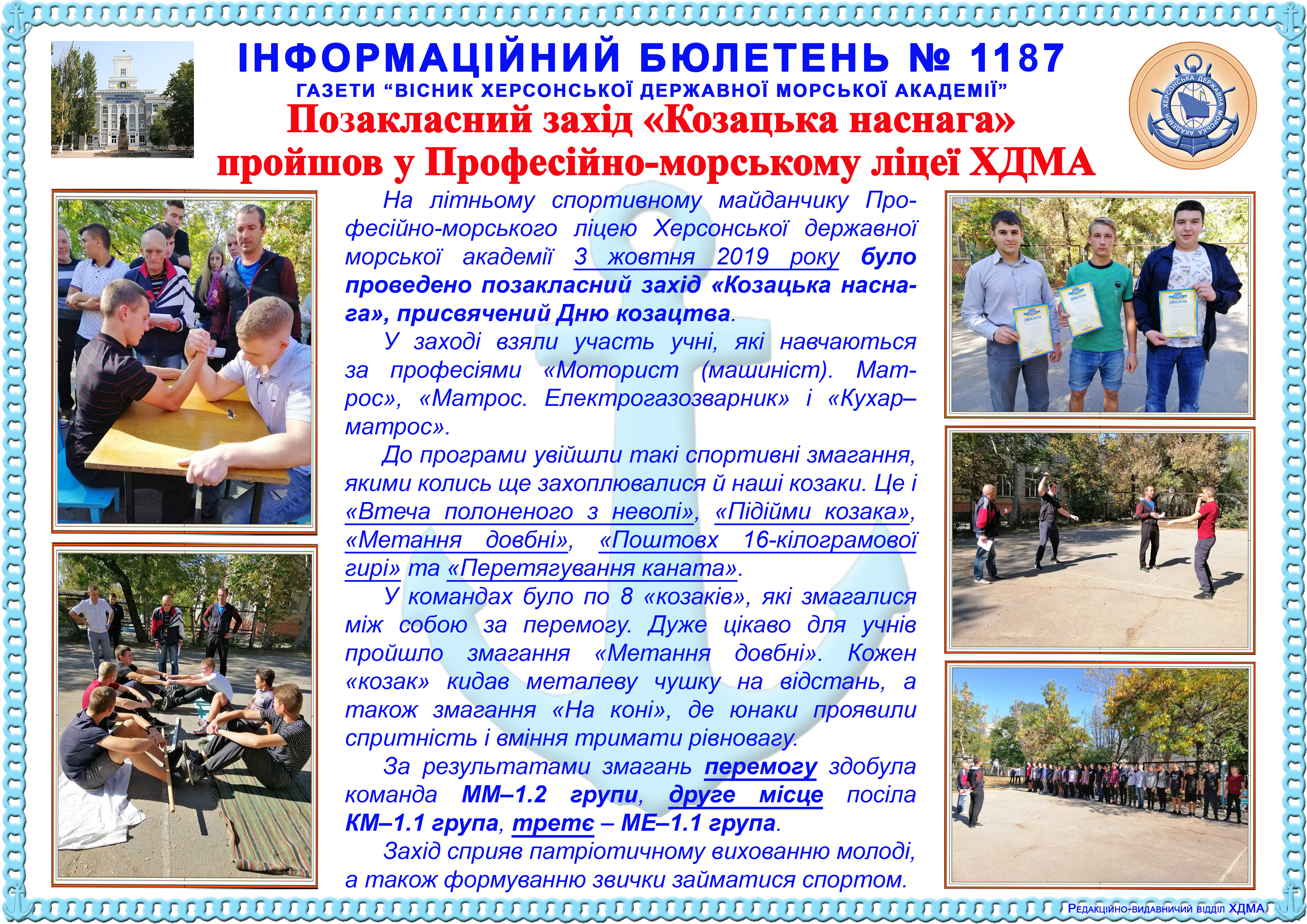 Title: Інформаційний бюлетень № 1187 Позакласний захід «Козацька наснага» пройшов у Професійно-морському ліцеї ХДМА