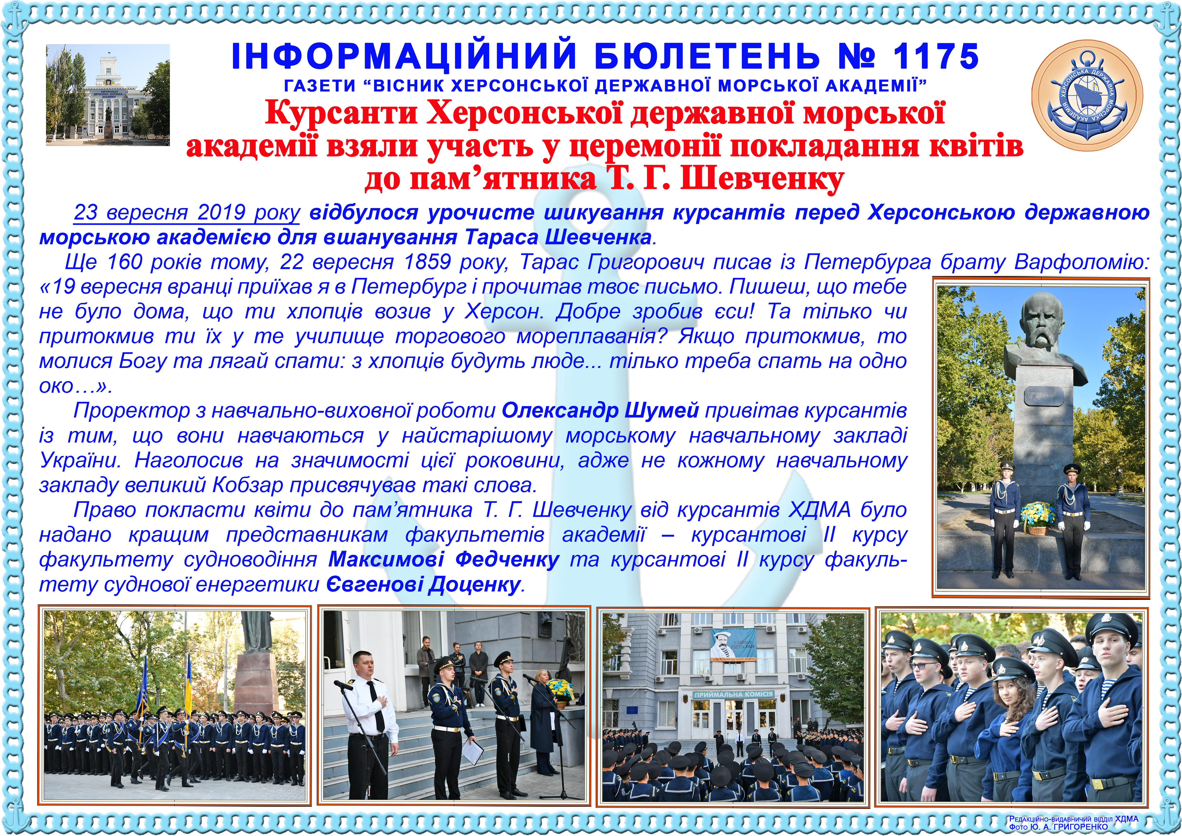 http://repnew.ksma.ks.ua/jspui/handle/123456789/1818| Title: | Інформаційний бюлетень № 1175 Курсанти Херсонської державної морської академії взяли участь у церемонії покладання квітів до пам’ятника Т. Г. Шевченку |