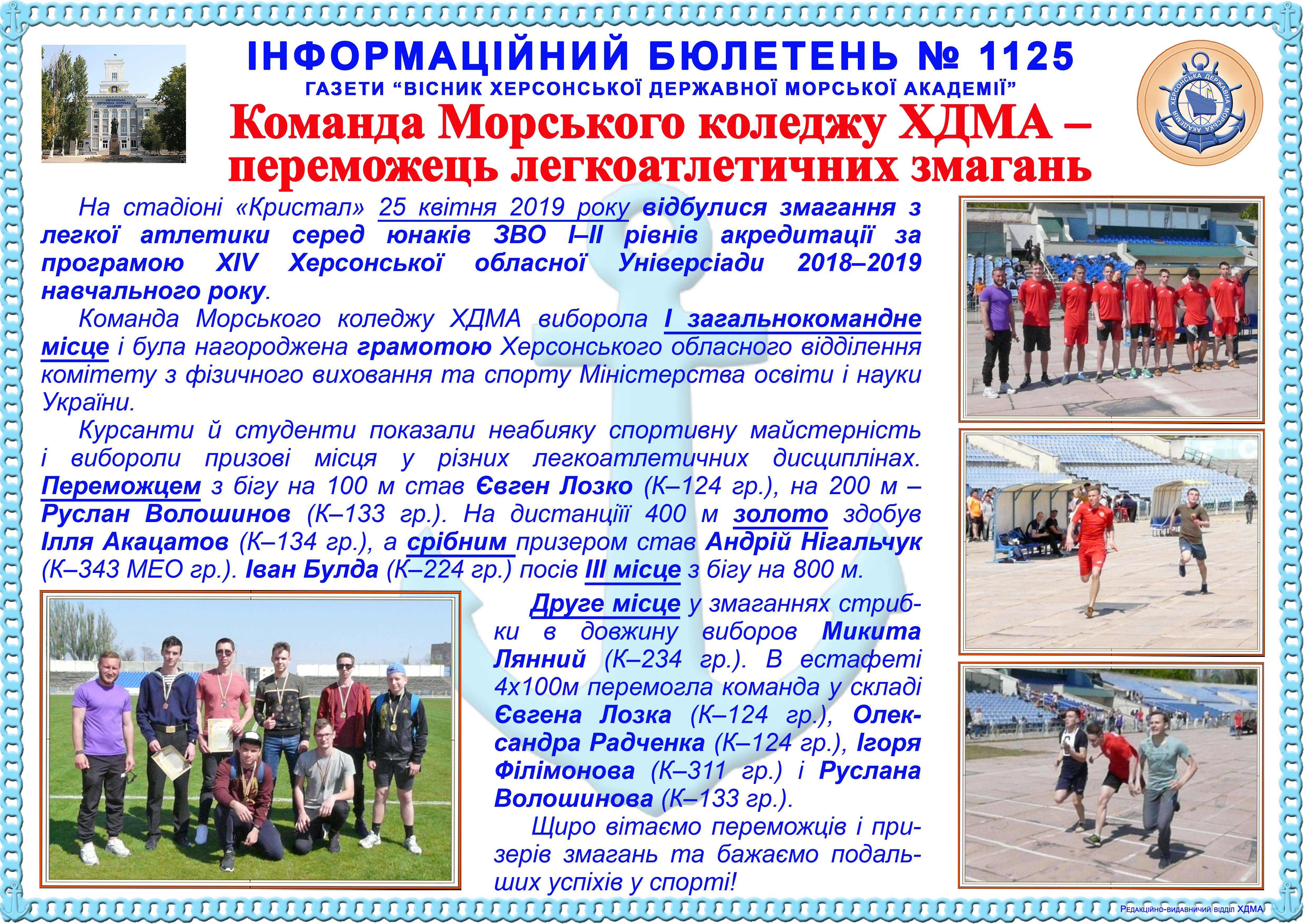 http://repnew.ksma.ks.ua/jspui/handle/123456789/1867| Title: | Інформаційний бюлетень № 1125 Команда Морського коледжу ХДМА – переможець легкоатлетичних змагань |