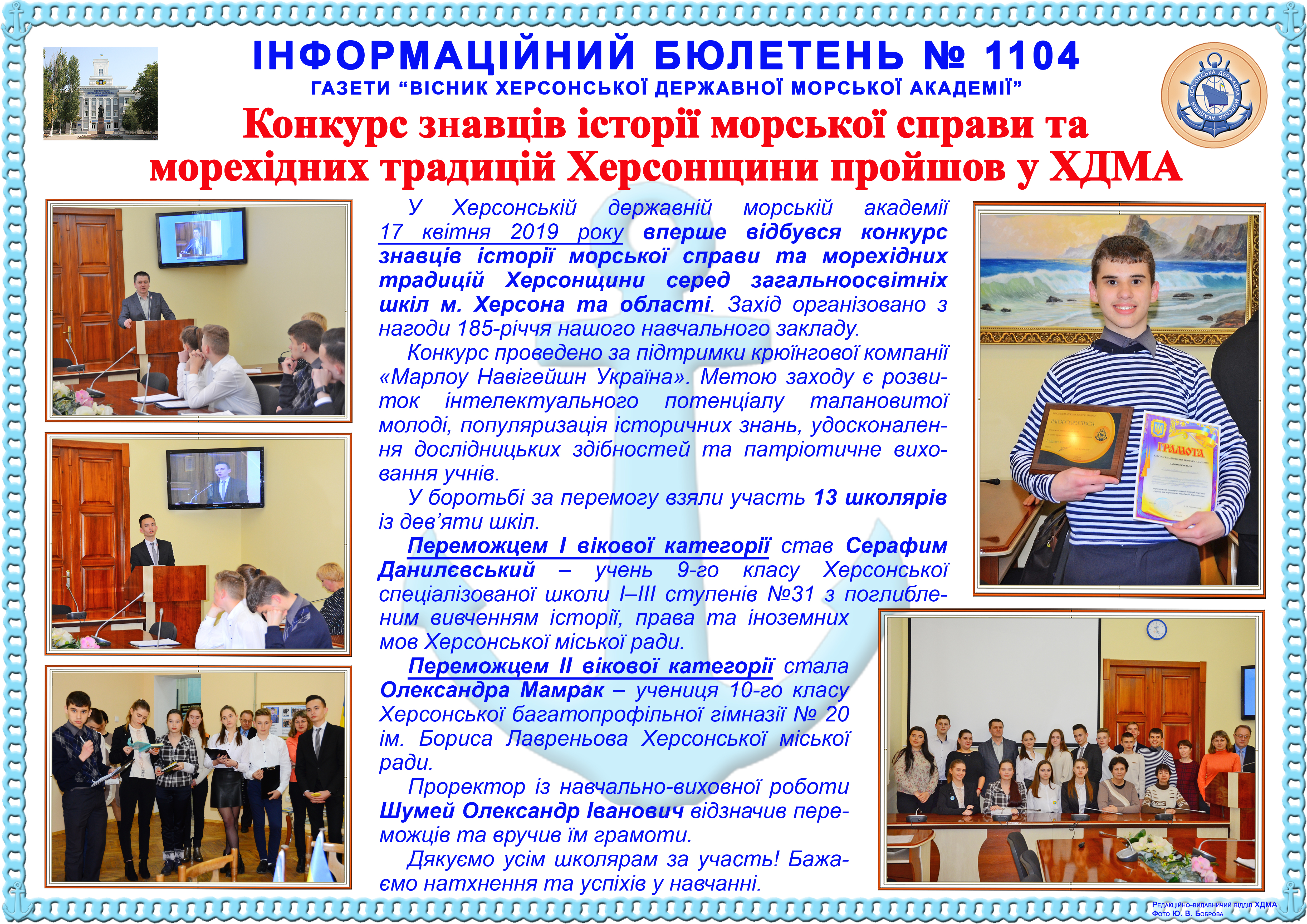 http://repnew.ksma.ks.ua/jspui/handle/123456789/1946| Title: | Інформаційний бюлетень № 1104 Конкурс знавців історії морської справи та морехідних традицій Херсонщини пройшов у ХДМА |