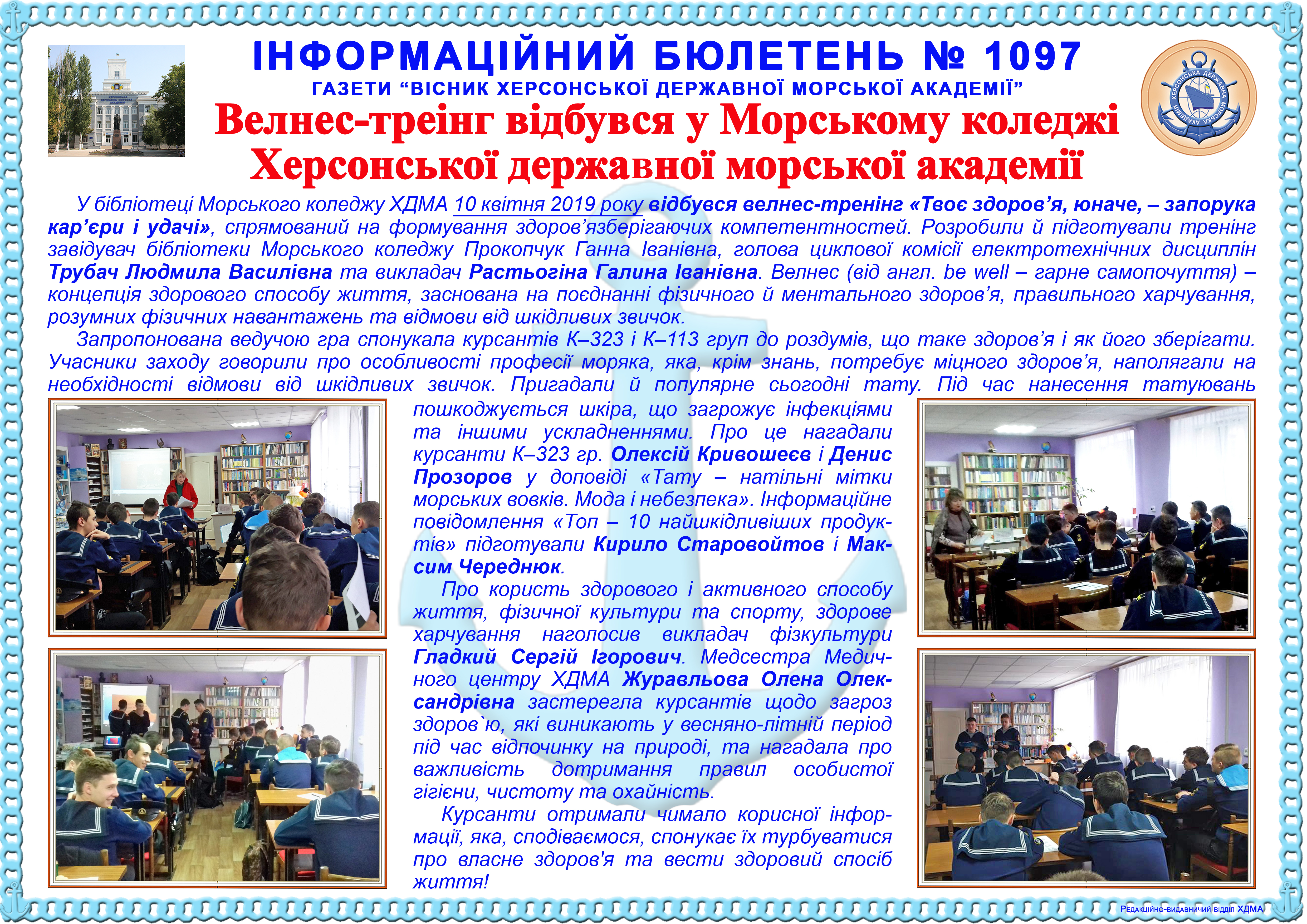 http://repnew.ksma.ks.ua/jspui/handle/123456789/1951| Title: | Інформаційний бюлетень № 1097 Велнес-треінг відбувся у Морському коледжі Херсонської державної морської академії |
