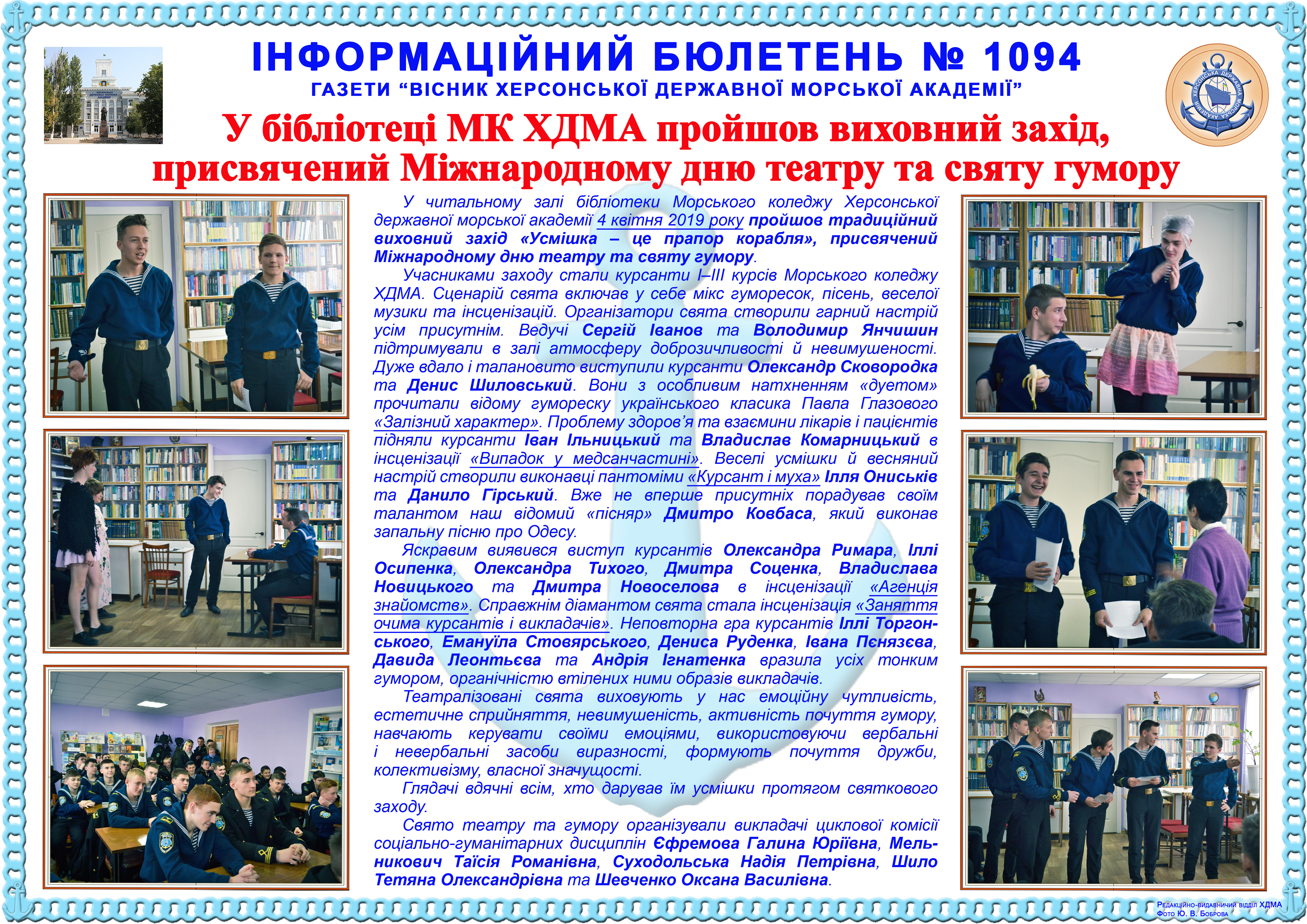 http://repnew.ksma.ks.ua/jspui/handle/123456789/1954| Title: | Інформаційний бюлетень № 1094 У бібліотеці МК ХДМА пройшов виховний захід, присвячений Міжнародному дню театру та святу гумору |