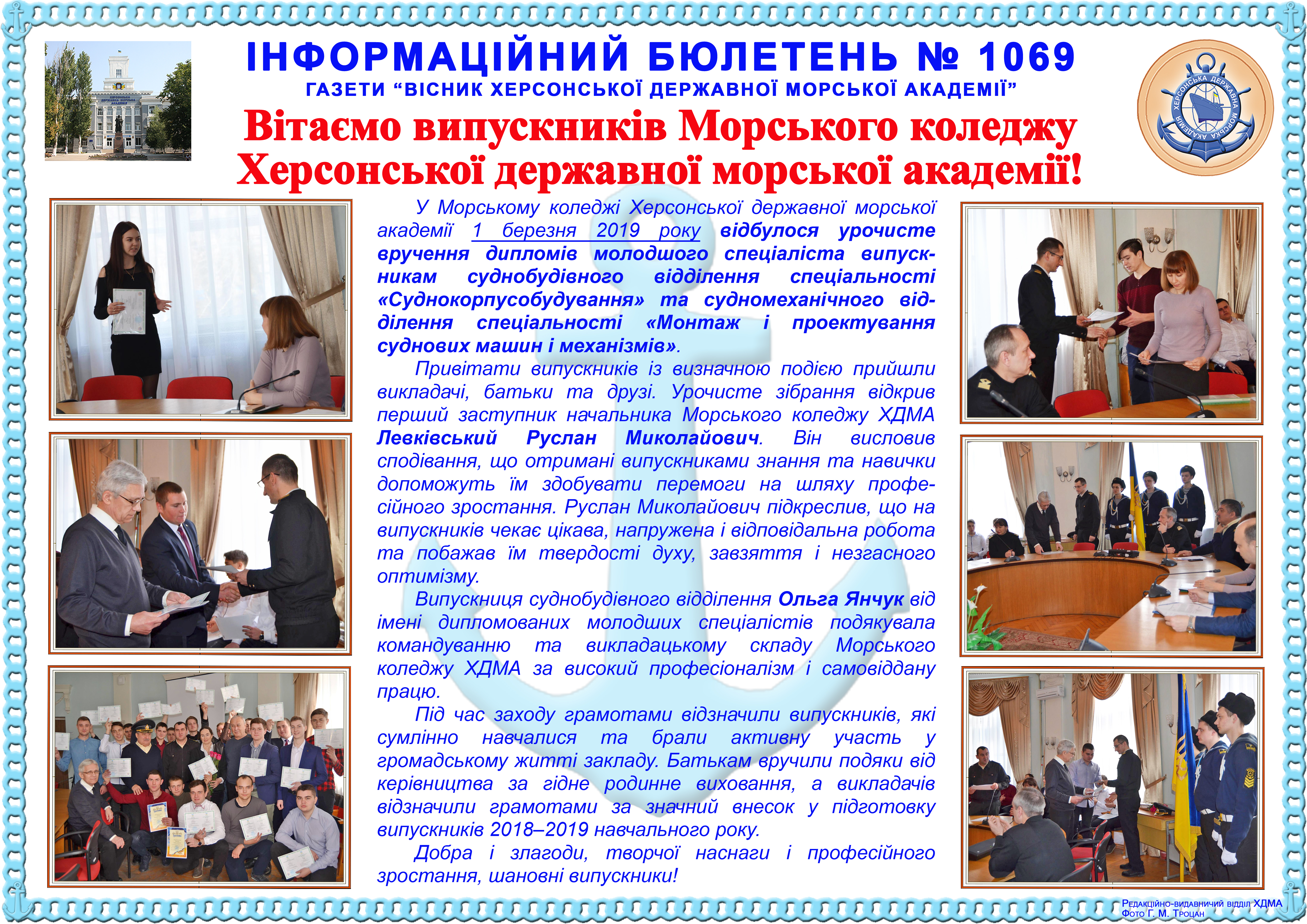http://repnew.ksma.ks.ua/jspui/handle/123456789/1975| Title: | Інформаційний бюлетень № 1069 Вітаємо випускників Морського коледжу ХДМА! |