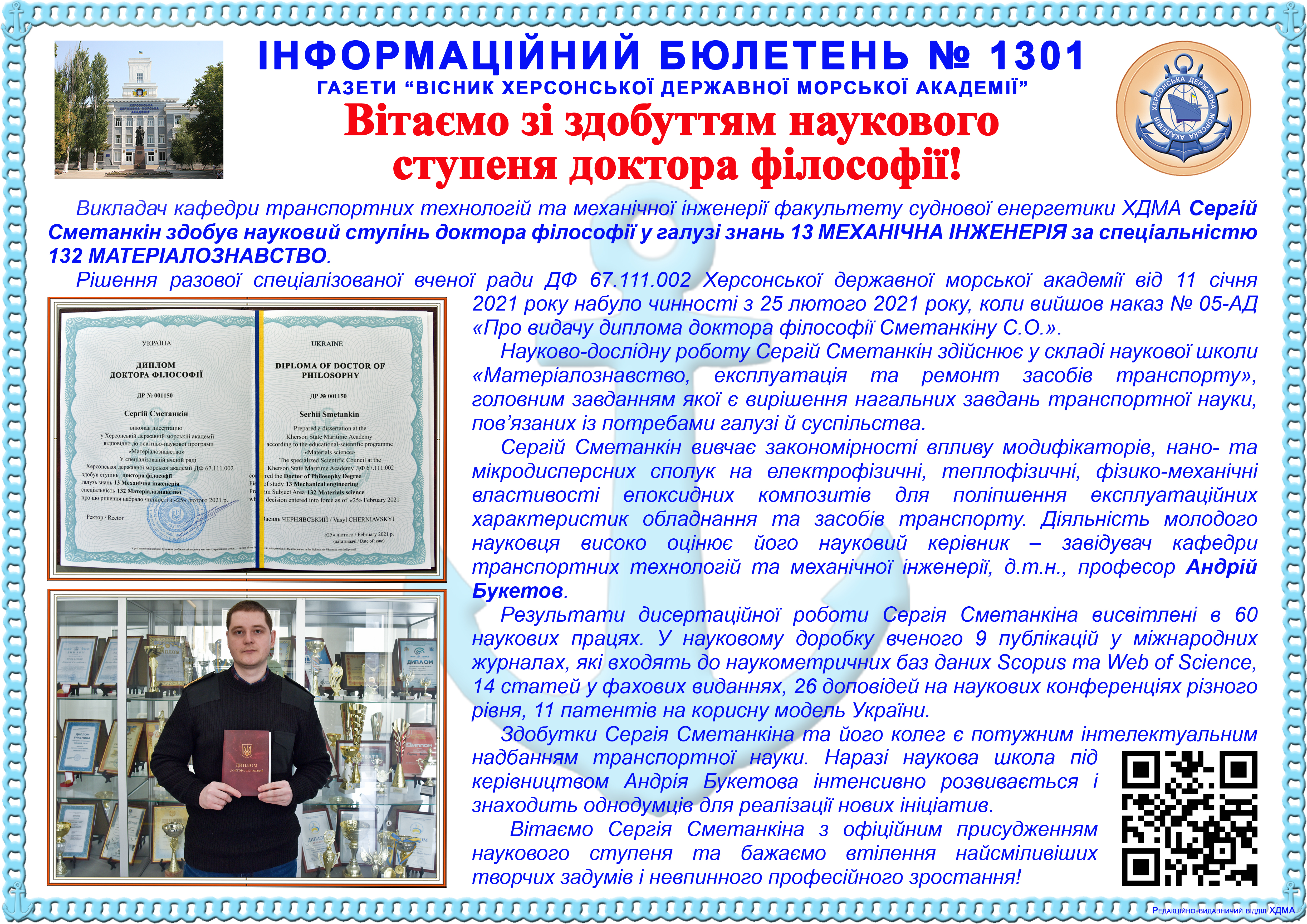http://repnew.ksma.ks.ua/jspui/handle/123456789/1992| Title: | Інформаційний бюлетень № 1301 Вітаємо зі здобуттям наукового ступеня доктора філософії! |