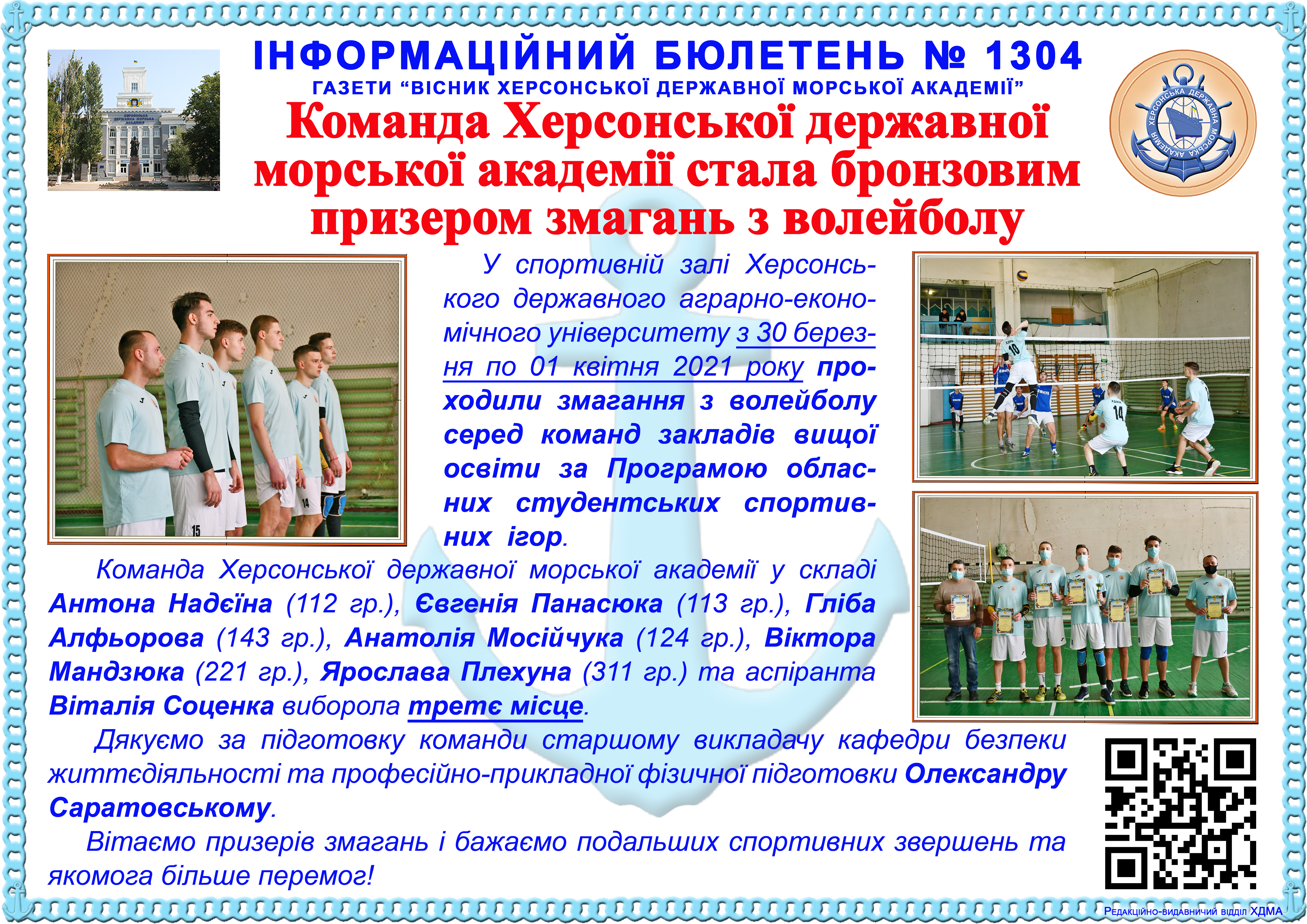 http://repnew.ksma.ks.ua/jspui/handle/123456789/1994| Title: | Інформаційний бюлетень № 1304 Команда Херсонської державної морської академії стала бронзовим призером змагань з волейболу |