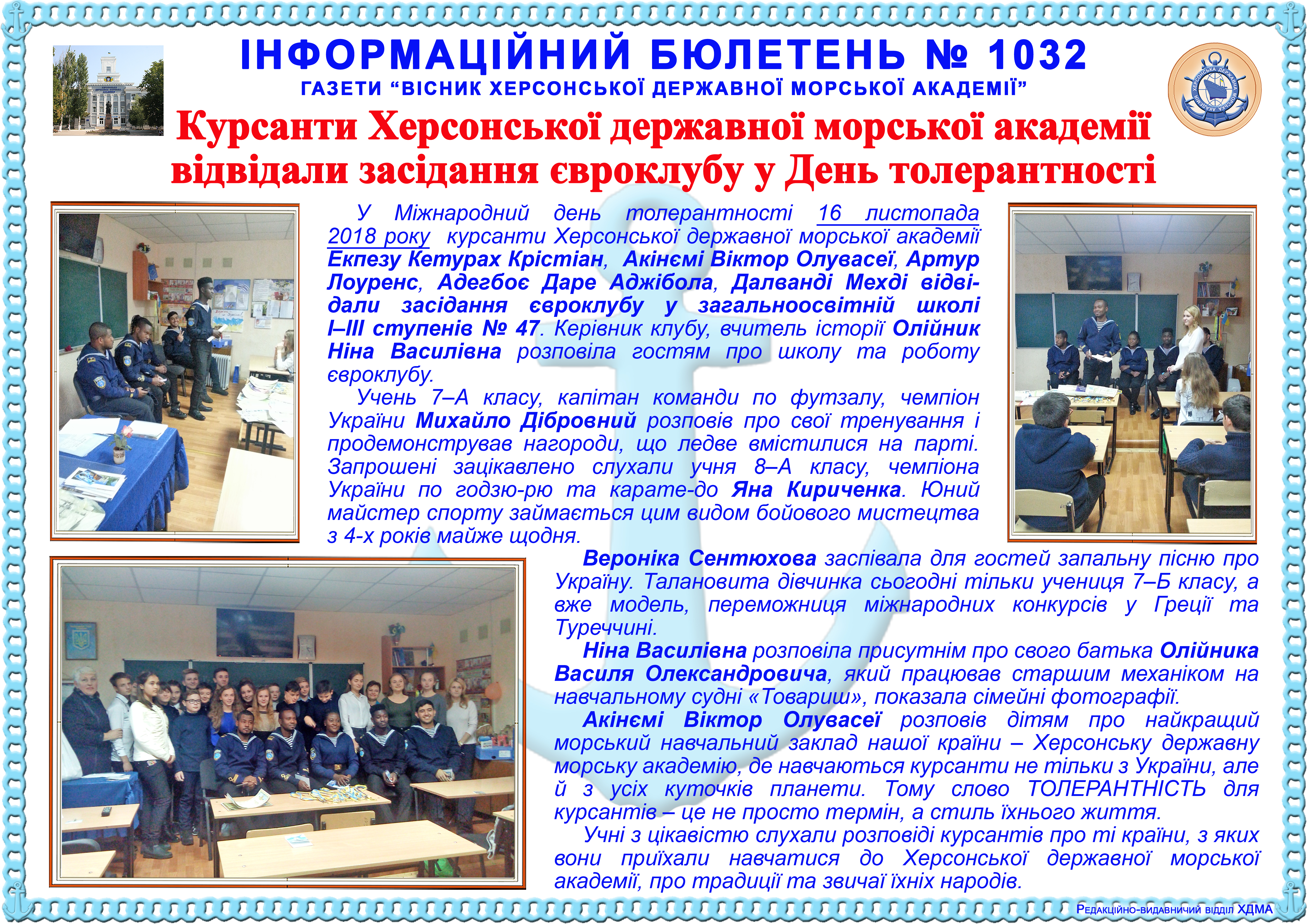 http://repnew.ksma.ks.ua/jspui/handle/123456789/2014| Title: | Інформаційний бюлетень № 1032 Курсанти Херсонської державної морської академії відвідали засідання євроклубу у День толерантності |