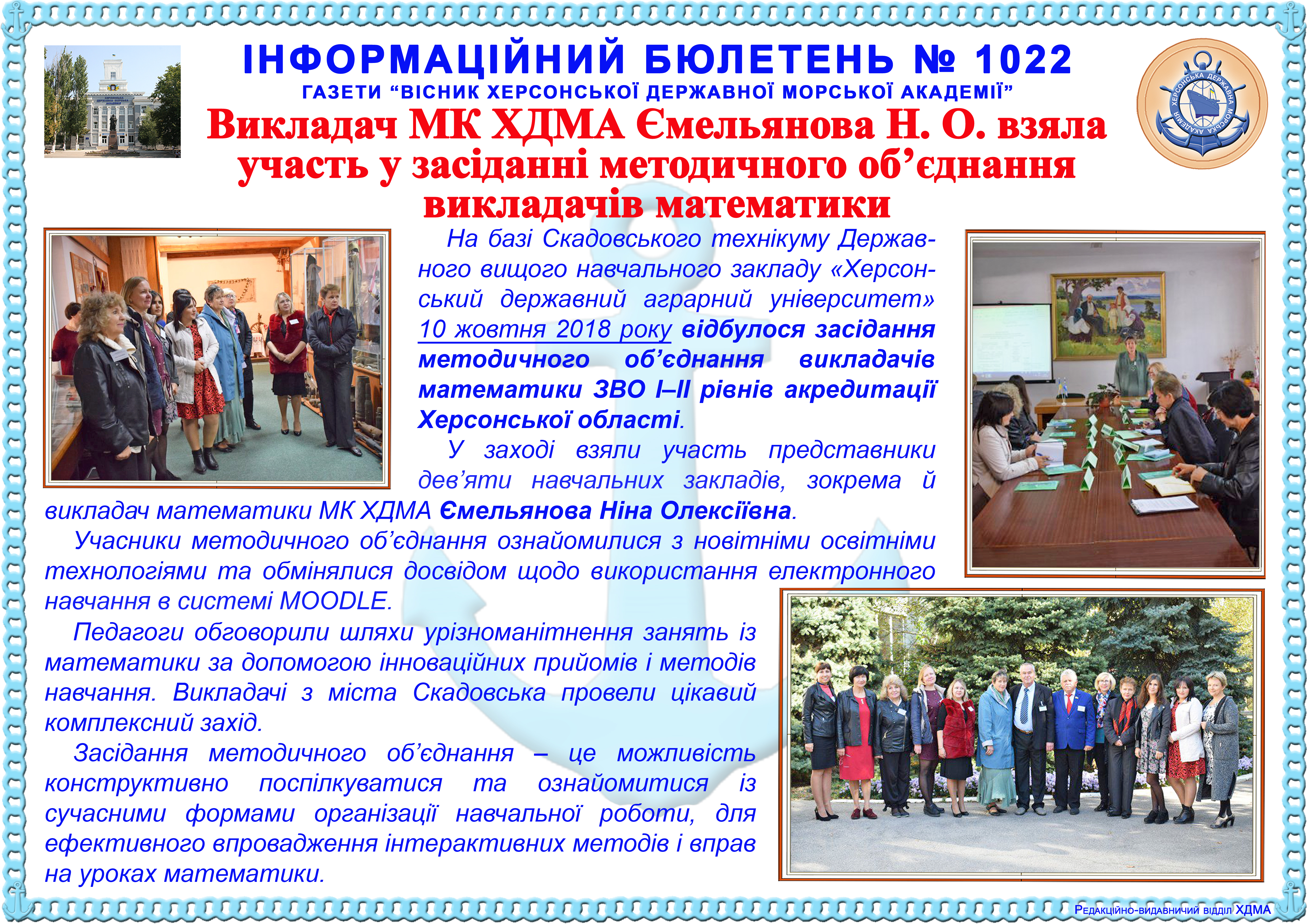 http://repnew.ksma.ks.ua/jspui/handle/123456789/2022| Title: | Інформаційний бюлетень № 1022 Викладач МК ХДМА Ємельянова Н. О. взяла участь у засіданні методичного об’єднання викладачів математики |