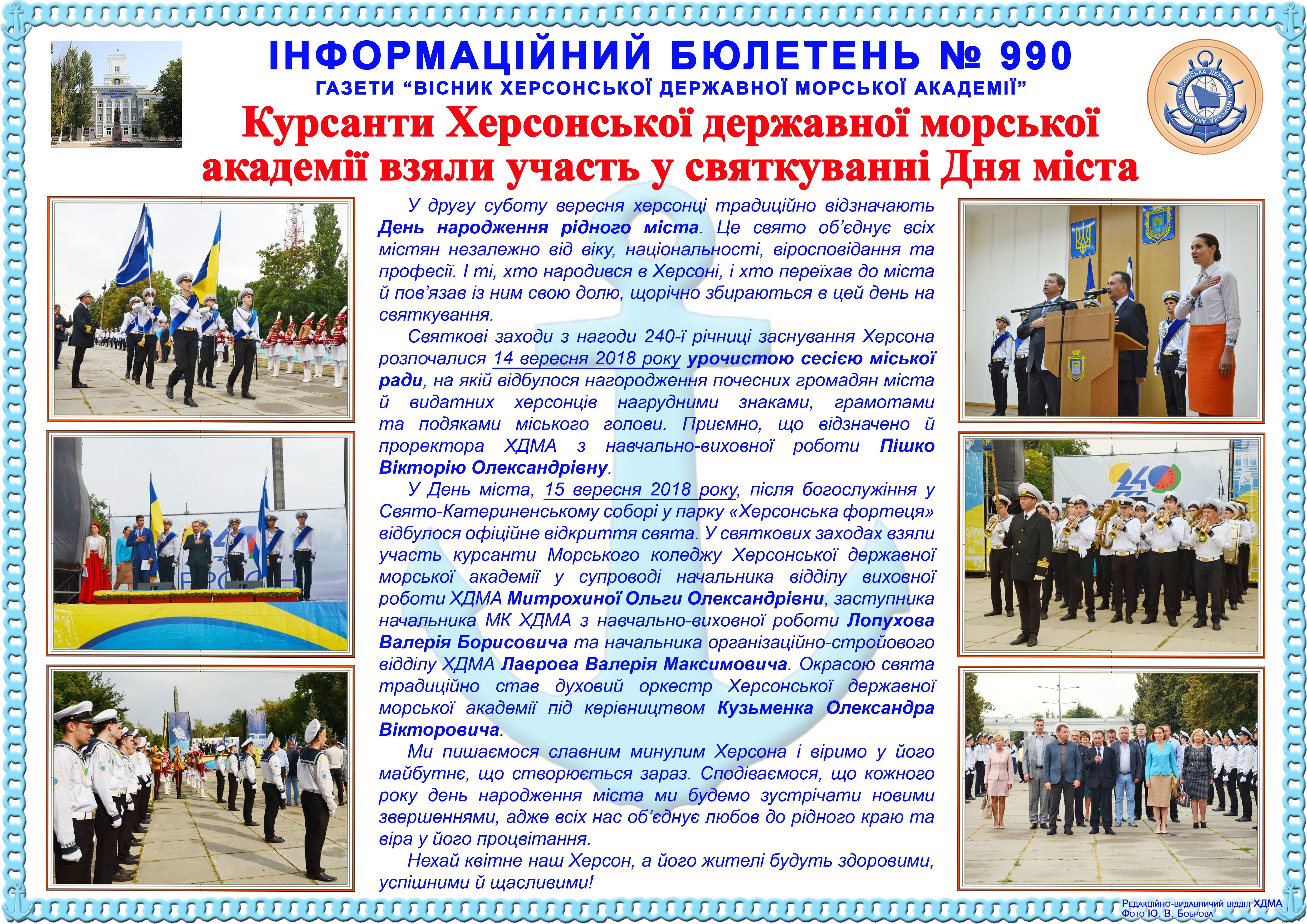 http://repnew.ksma.ks.ua/jspui/handle/123456789/2055| Title: | Інформаційний бюлетень № 990 Курсанти Херсонської державної морської академії взяли участь у святкуванні Дня міста |