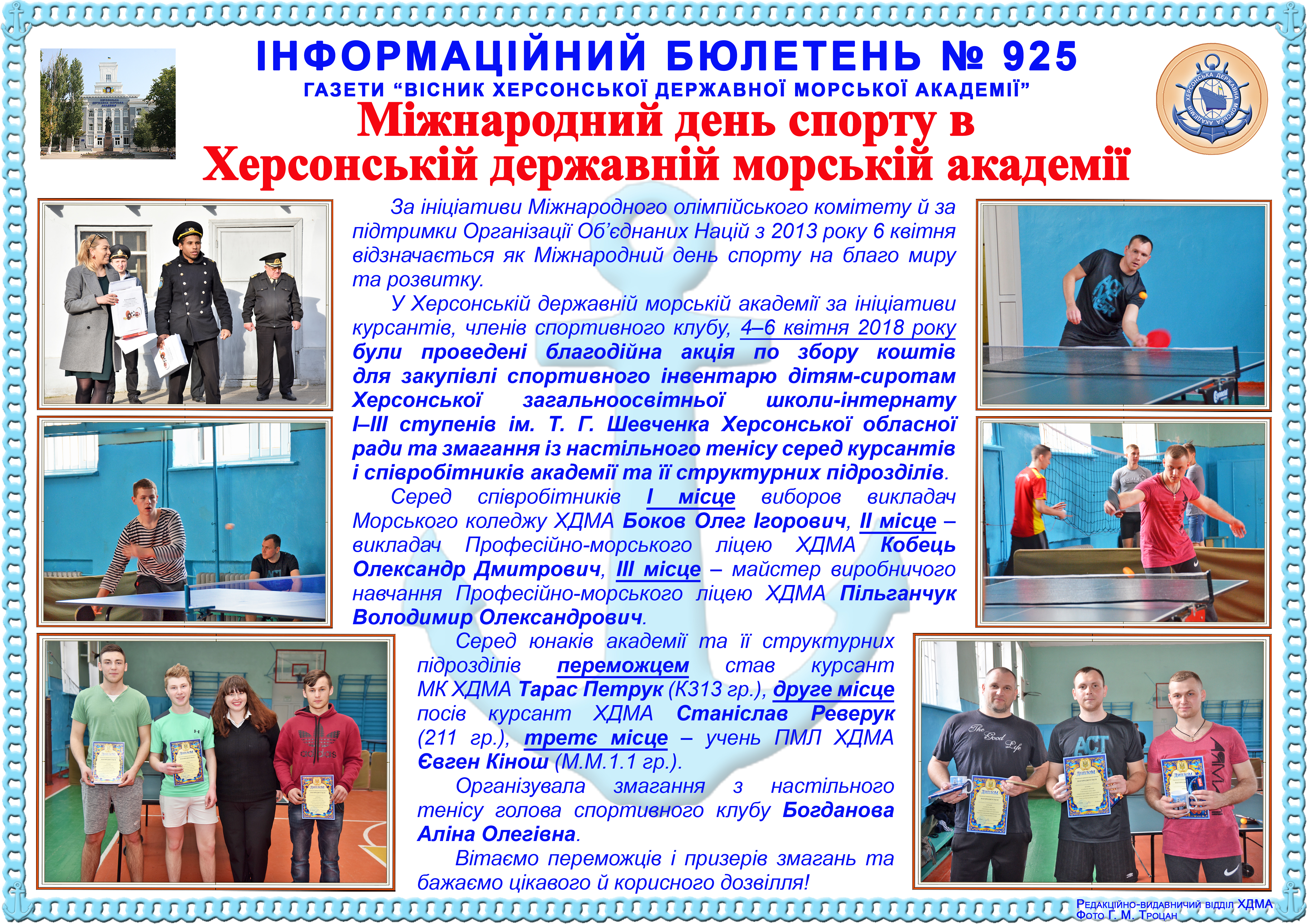 http://repnew.ksma.ks.ua/jspui/handle/123456789/2129| Title: | Інформаційний бюлетень № 925 Міжнародний день спорту у Херсонській державній морській академії |