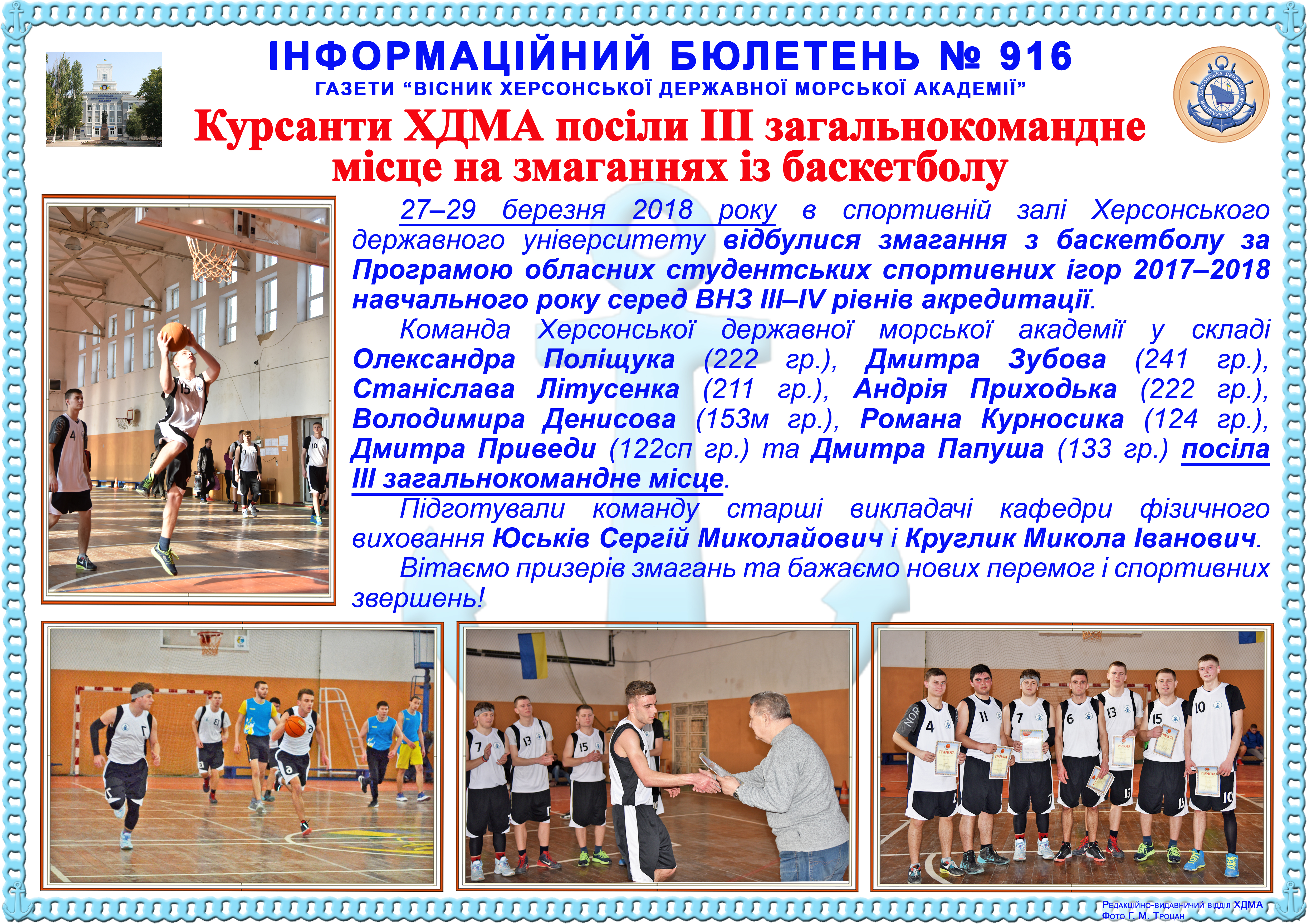 http://repnew.ksma.ks.ua/jspui/handle/123456789/2137| Title: | Інформаційний бюлетень № 916 Курсанти ХДМА посіли ІІІ загальнокомандне місце на змаганнях із баскетболу |