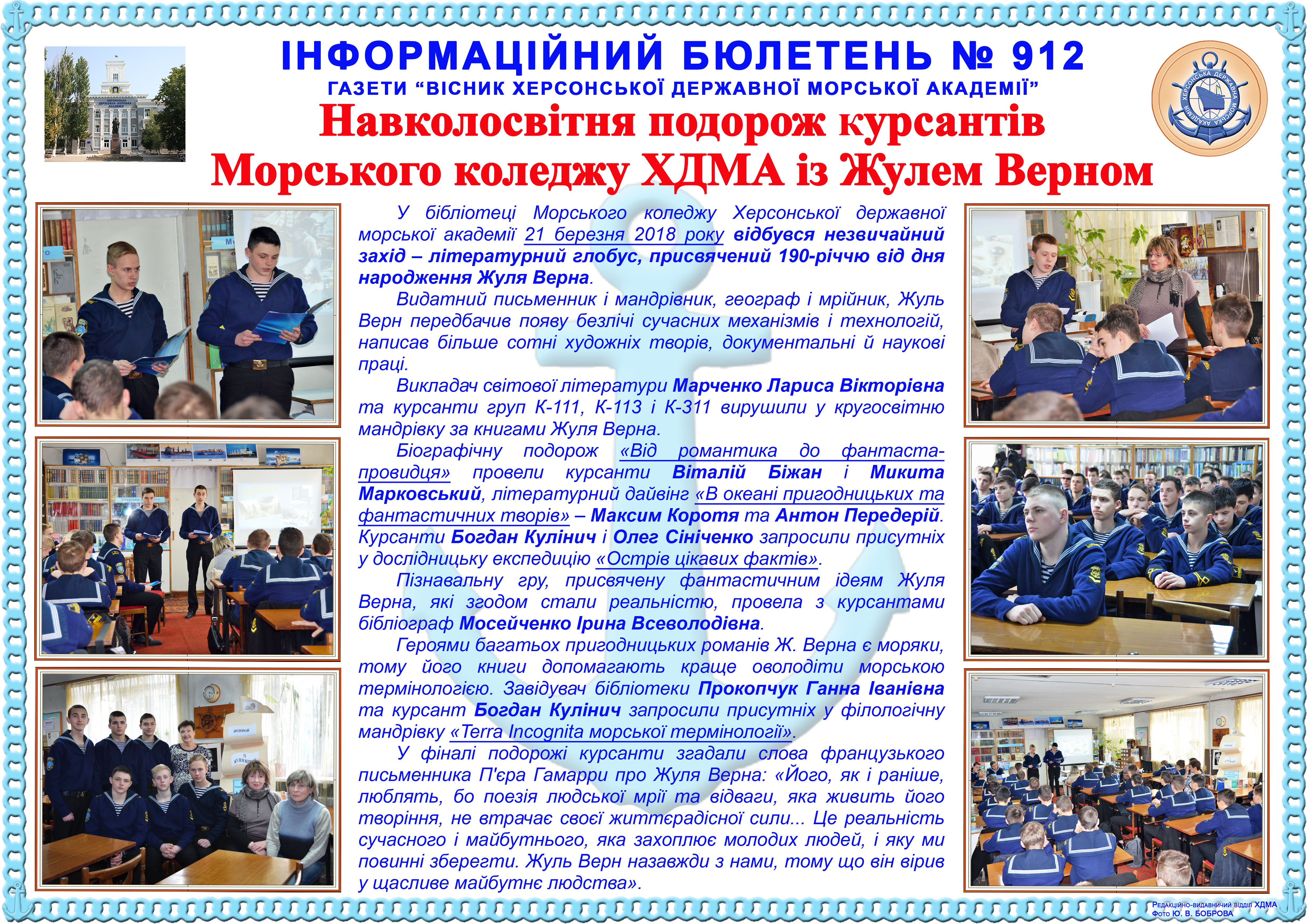 http://repnew.ksma.ks.ua/jspui/handle/123456789/2140| Title: | Інформаційний бюлетень № 912 Навколосвітня подорож курсантів Морського коледжу ХДМА із Жулем Верном |