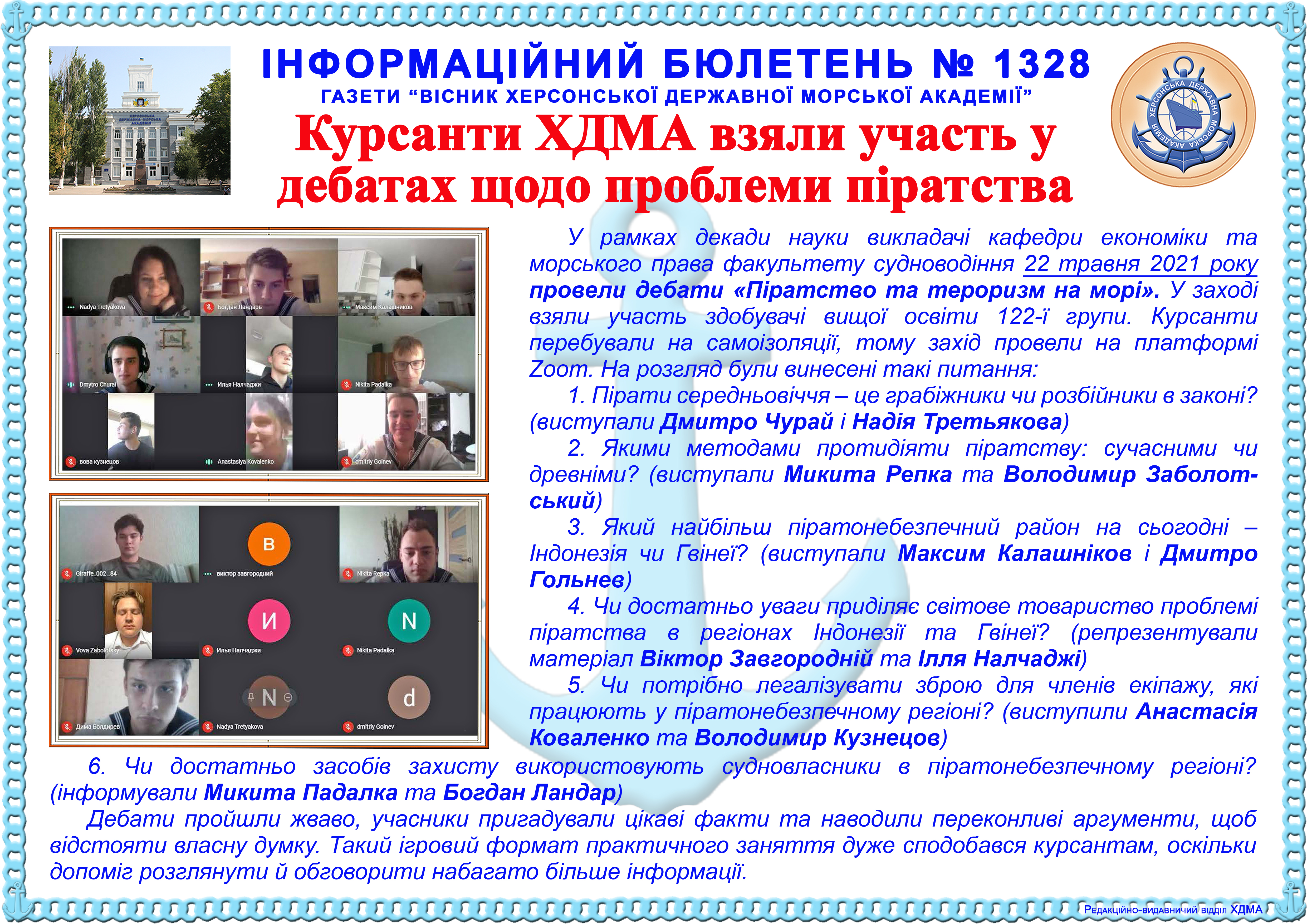 Title: Інформаційний бюлетень № 1328 Курсанти ХДМА взяли участь у дебатах щодо проблеми піратства