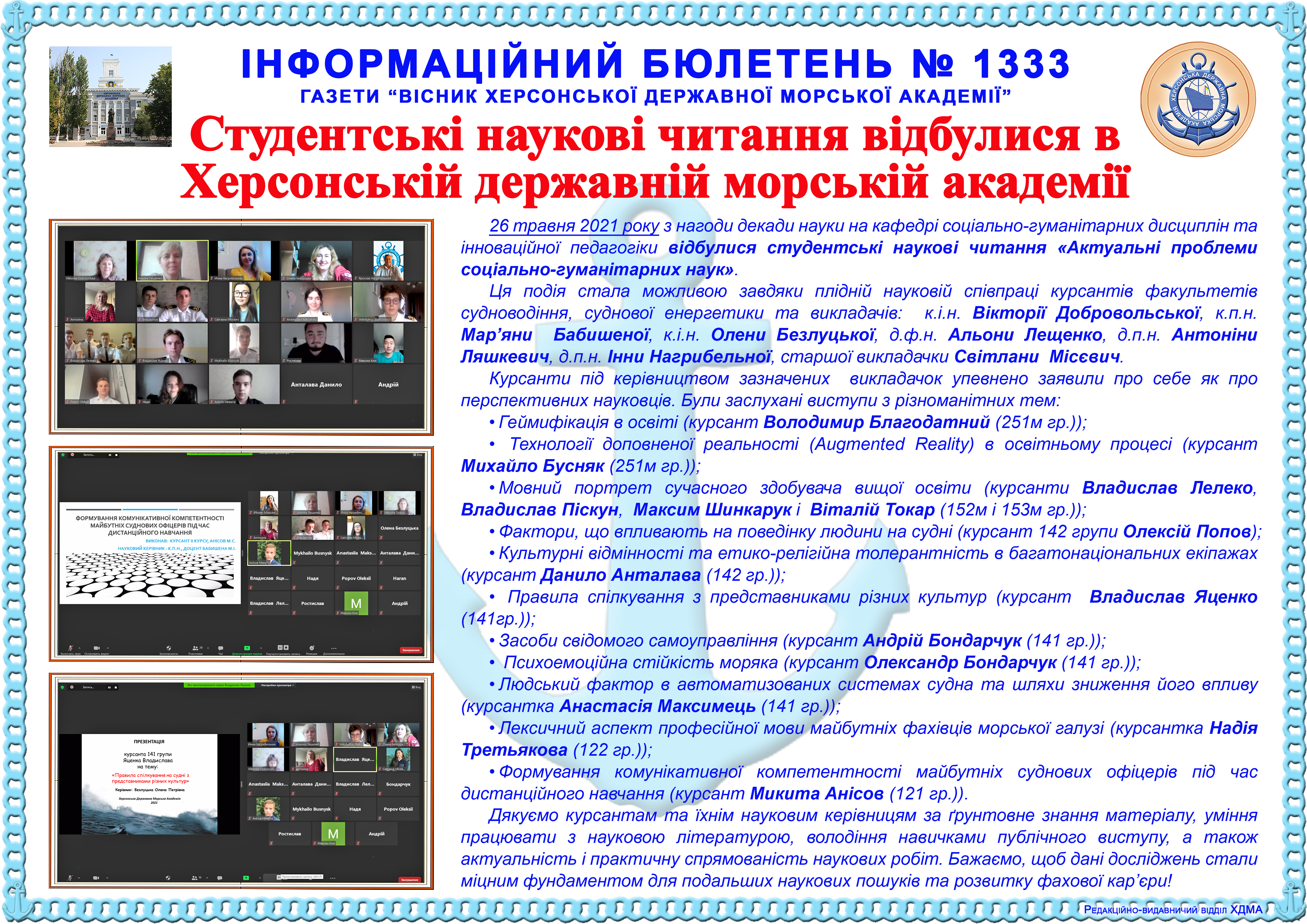 Title: Інформаційний бюлетень № 1333 Студентські наукові читання відбулися в Херсонській державній морській академії