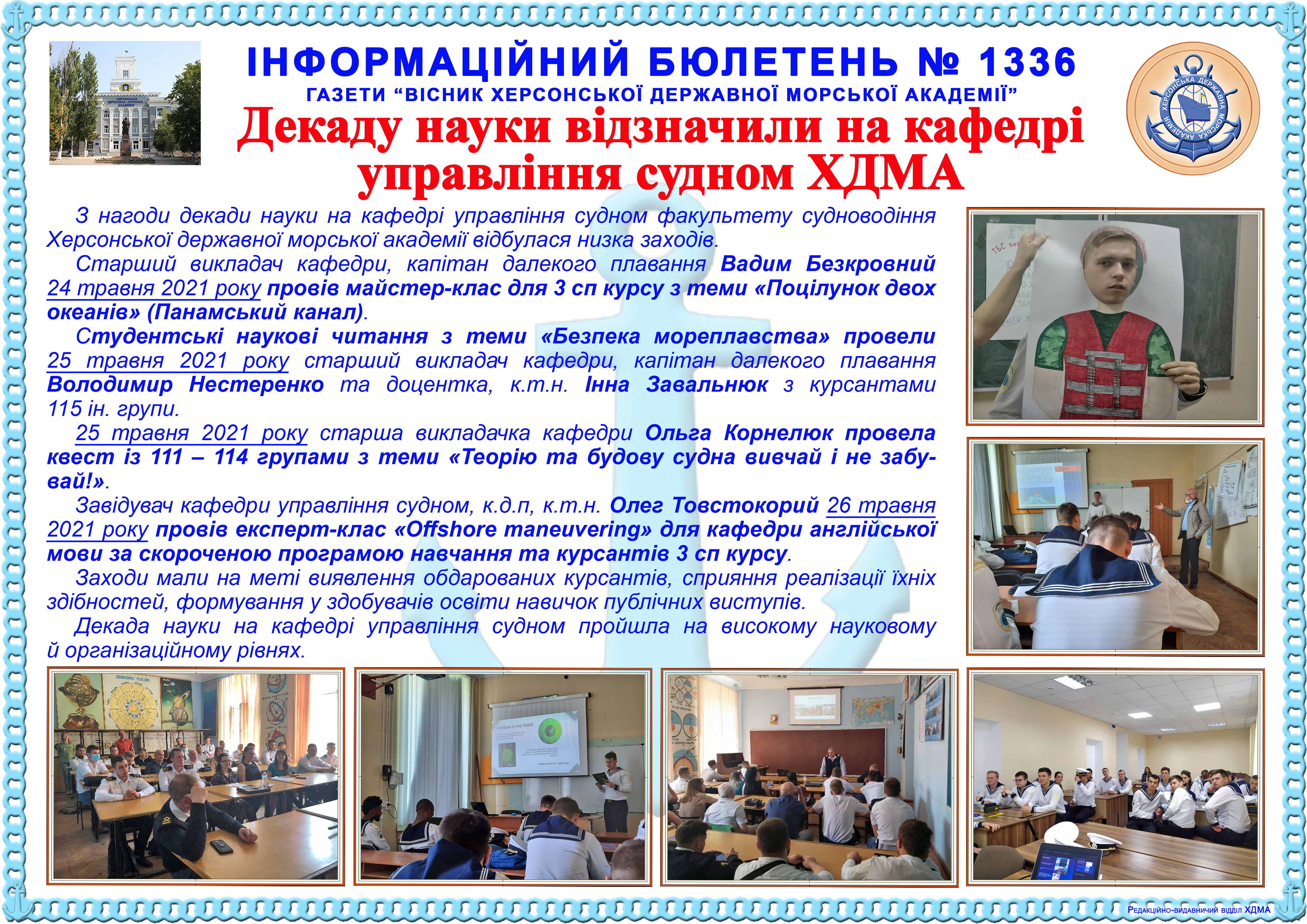 http://repnew.ksma.ks.ua/jspui/handle/123456789/2260| Title: | Інформаційний бюлетень № 1336 Декаду науки відзначили на кафедрі управління судном ХДМА |