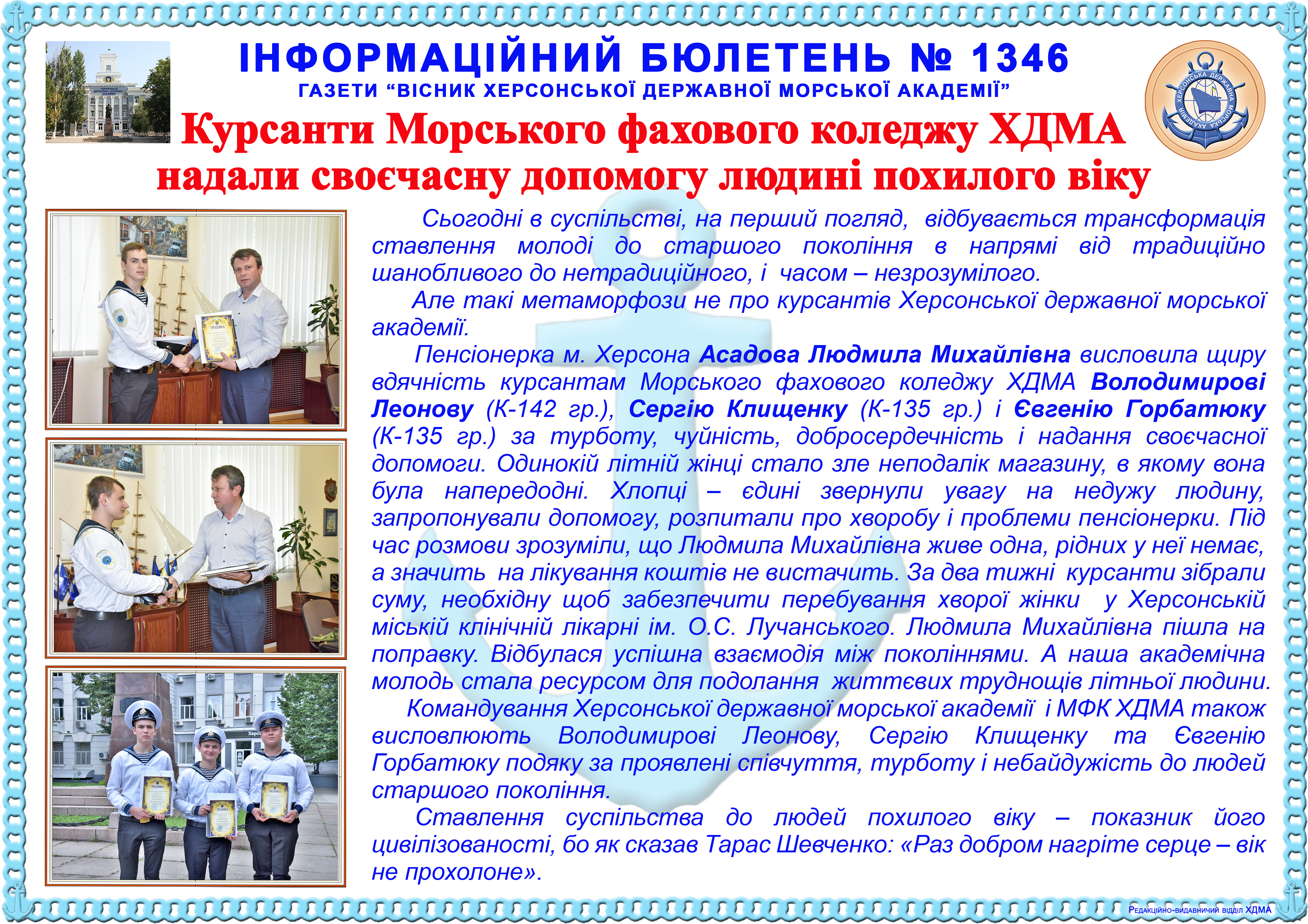 http://repnew.ksma.ks.ua/jspui/handle/123456789/2268| Title: | Інформаційний бюлетень № 1346 Курсанти Морського фахового коледжу ХДМА надали своєчасну допомогу людині похилого віку |